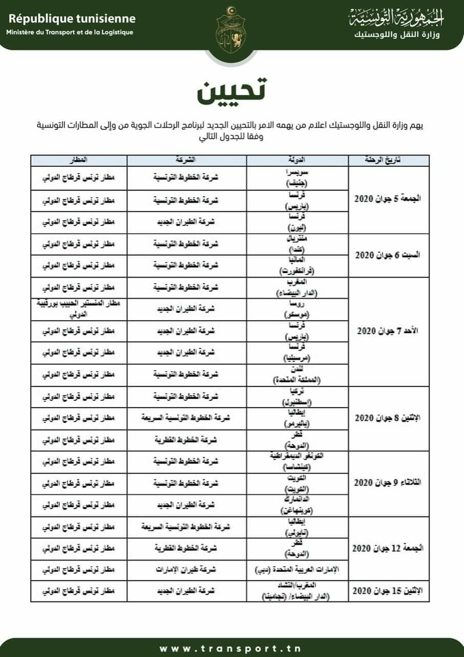 على اثر اجتماع اللجنة الوطنية المعنية بعودة التونسيين بالخارج الى ارض الوطن. تقرروضع برنامج لرحلات العودة بداية من يوم 5 جوان 2020 انطلاقا من عدة وجهات وفقا للجدول المصاحب الذي يظل قابلا للتحيين.