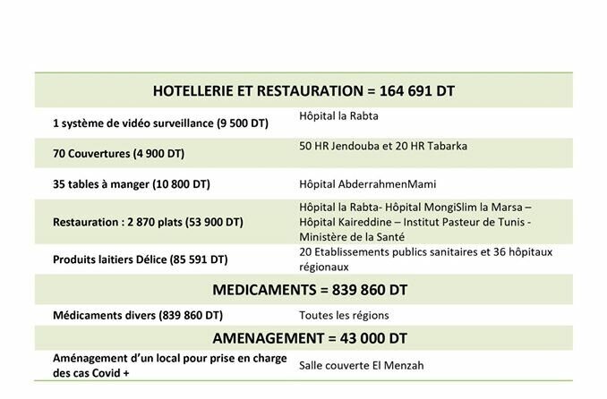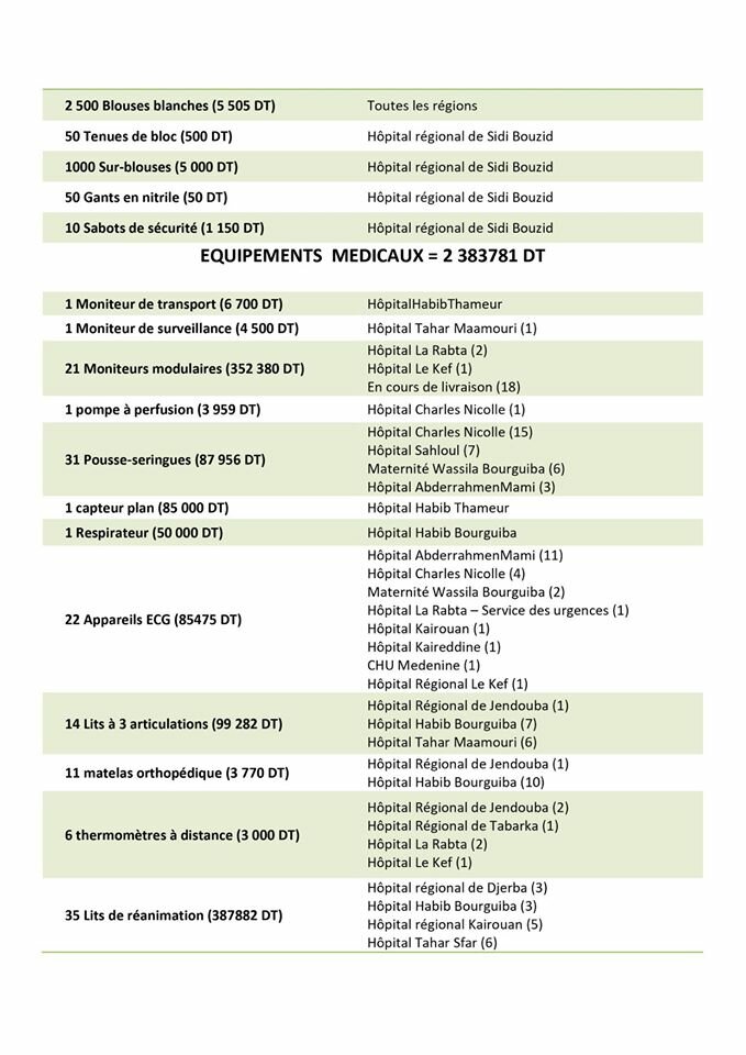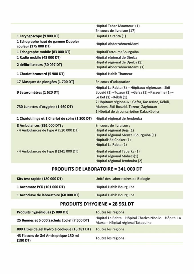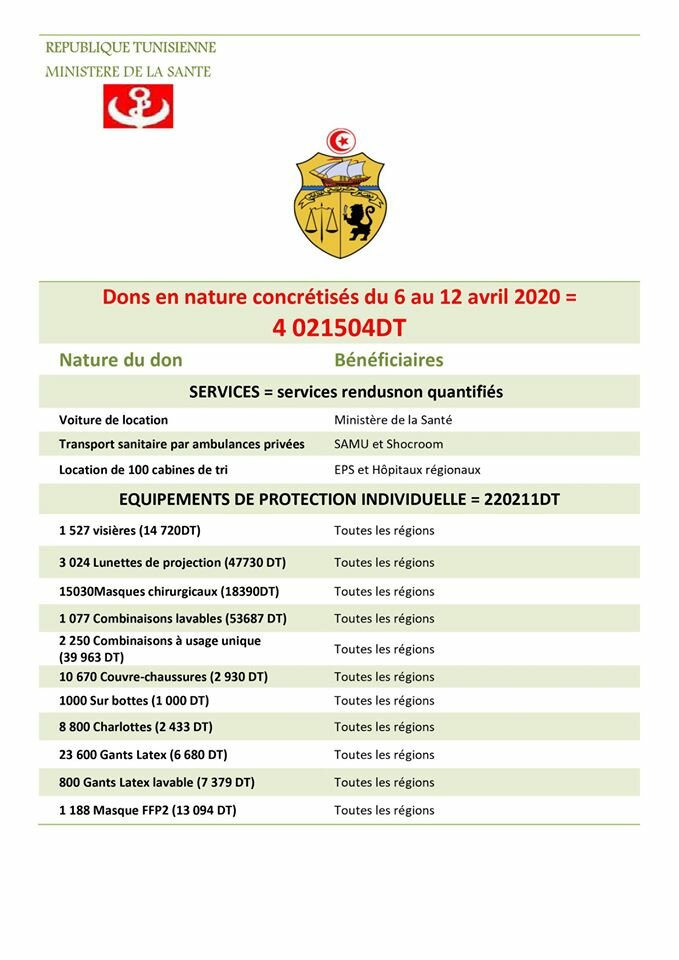 La commission des dons du Ministère de la Santé a le plaisir de vous présenter au travers du tableau suivant les résultats de ses travaux au cours de la semaine du 06 au 12 avril 2020 et remercie à cette occasion tous les donateurs, qu’ils soient particuliers, des entreprises ou des associations, et leur promet de bien gérer leurs dons et de les orienter vers les structures .de santé publique selon leur désir et selon les exigences de la stratégie de lutte contre le Coronavirus